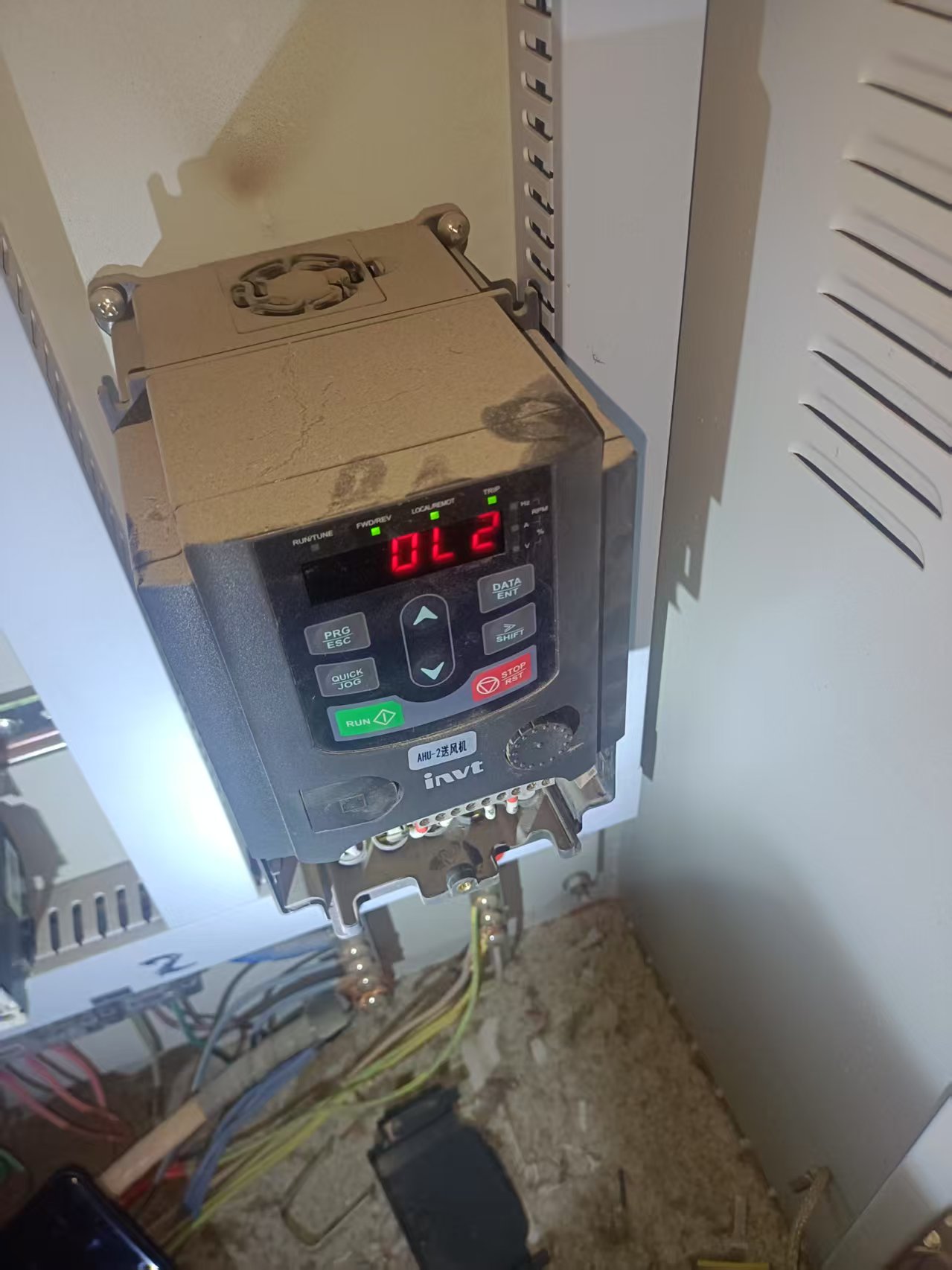 ,图里这个是英威腾 INVT 变频器,显示的故障代码是 “OL2”。